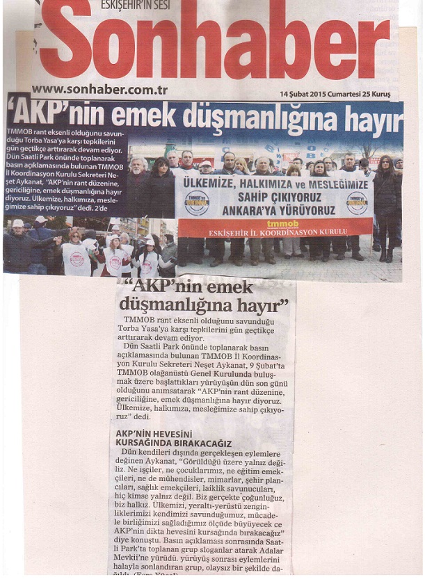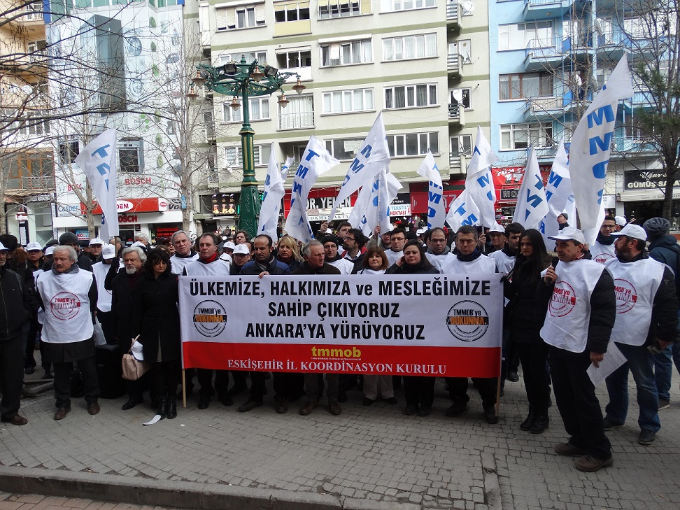 Bu duruma karşı biz mühendis, mimar, şehir plancısı örgütleri olarak geçen ay, "AKP`nin torba yasasına izin vermeyeceğiz" kampanyasını başlattık. Çevre ve Şehircilik Bakanlığı ve ona bağlı il müdürlüklerinin önlerinde yapılan açıklamalarla ve "Talana, Yalana, Yağmaya İzin Verecek miyiz?" broşürlerimizi ve bildirilerimizi halkımıza dağıttık. Şimdi de, 9 Şubat Pazartesi gününden itibaren, 14 Aralık`ta Ankara`da yapılacak olan TMMOB Olağanüstü Genel Kurulu`nda buluşmak üzere, ülkemizin sekiz ayrı noktasından yürüyüşler yapıyoruz. Bugün yürüyüşümüzün son günü. "Ülkemize, Halkımıza, Mesleğimize Sahip Çıkıyoruz" diyerek gerici, rantçı, emek düşmanı, zorba AKP iktidarına karşı "direnişi büyütme zamanıdır" diyoruz.