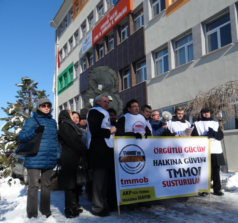 TMMOB üyeleri, TMMOB Yasası`ndaki değişiklikleri içeren torba yasayı 8 Ocak 2015 Perşembe günü Çevre ve Şehircilik Bakanlığı İl Müdürlükleri önüne siyah çelenk bırakarak protesto etti.