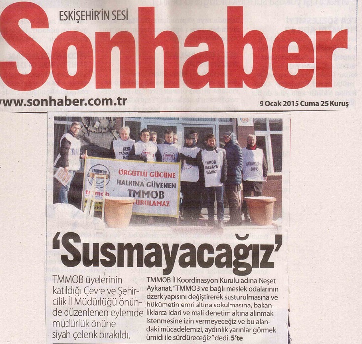 meslek alanlarımızın ve örgütümüz TMMOB`nin tüm birikimlerini halkımızın yararına kullanmaya, AKP iktidarının yarattığı rant düzenini teşhir etmeye, ülkemizi aydınlık geleceğe taşımak için var gücümüzle çalışmaya devam etmemizi engelleyemeyecektir.