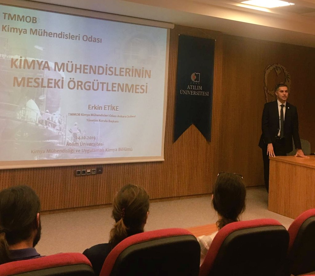 24.10.2019 Tarihinde Atılım Üniversitesi Kimya Mühendisliği ve Uygulamalı Kimya Bölümü öğrencileriyle bir araya geldik. Şube Başkanımız Erkin ETİKE "Kimya Mühendislerinin Mesleki Örgütlenmesi" konulu bir sunum gerçekleştirdi.