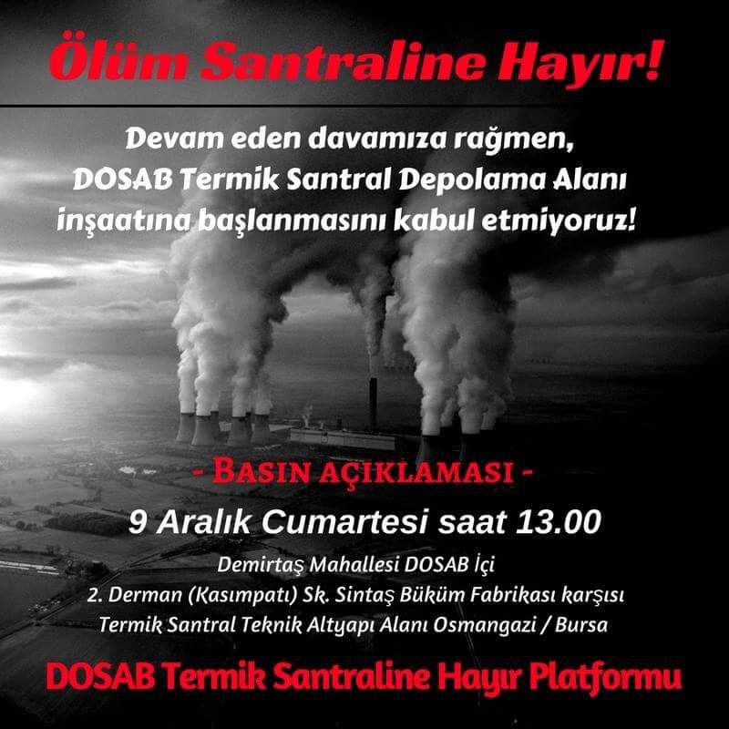 Devam eden davamıza rağmen, DOSAB Termik Santrali Depolama Alanında inşaata başlanmasını kabul etmiyoruz. Bu amaçla düzenlediğimiz basın açıklamasına tüm bursa halkını davet ediyoruz. Not: Basın Açıklaması ile ilgili izinler alınmıştır. Tarih: 9 Aralık 2017 Cumartesi Saat:13:00 Yer: Demirtaş Mahallesi DOSAB sınırının doğu yönü Zakkum Sokak ile 2. Derman Sokak birleştiği yer Termik Santral Alt Yapı Alanı Tabelası Önü