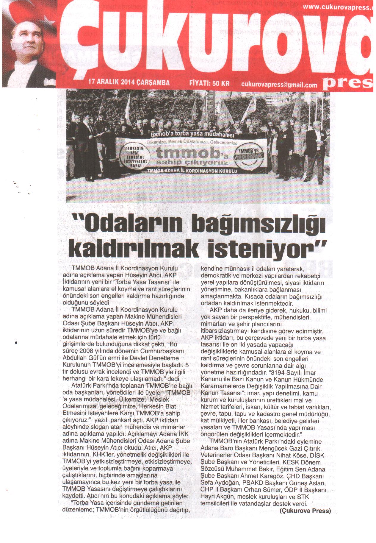 TMMOB Adana İl Koordinasyon Kurulu tarafından 17.12.2014 tarihinde Adana Atatürk Parkında Torba Yasaya karşı kamuoyunu bilgilendirmek amacıyla yapılan Basın Açıklaması basında...