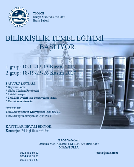 Bilirkişilik Kanunu kapsamında "Bilirkişilik Yönetmeliği" 03/08/2017 tarihinde Resmi Gazetede yayınlanmış ve yürürlüğe girmiştir. Bu yönetmelikte belirtildiği gibi bilirkişilik başvurusu yapacak kişiler için "Temel Bilirkişilik Eğitimi" zorunlu hale getirilmiştir. Odamız, 16.10.2017 tarihinde " Temel Bilirkişilik Eğitimleri " konusunda bakanlık tarafından yetkilendirilmiştir. Temel eğitim, 18 saati teorik ve 6 saati uygulamalı olmak üzere en az 24 ders saatinden oluşmaktadır. Eğitim sonunda katılımcılara katılım sertifikası verilecektir.