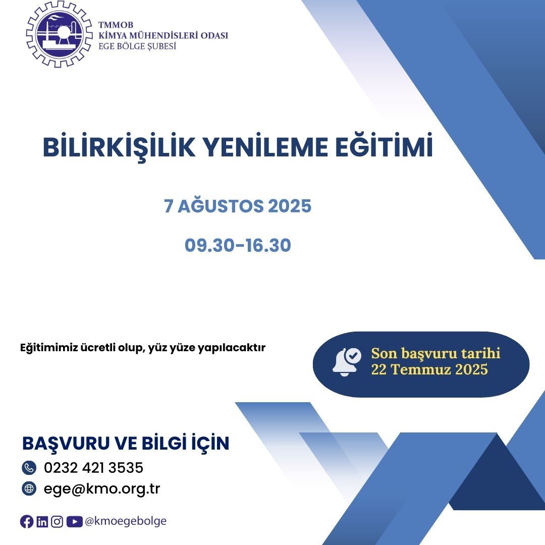 07 AĞUSTOS 2025 tarihinde 09.30-16.30 saatleri arasında, " BİLİRKİŞİLİK YENİLEME EĞİTİMİ" yüz yüze düzenlenecektir. Eğitim ile ilgili detaylı bilgi aşağıda yer almakta olup eğitime katılmak isteyenlerin, ön başvuru formunu doldurup 22 Temmuz 2025 tarihine kadar göndermelerini, ödeme için teyid beklemelerini rica ederiz. Saygılarımızla, TMMOB Kimya Mühendisleri Odası Ege Bölge Şubesi Tel:0 232 421 3535