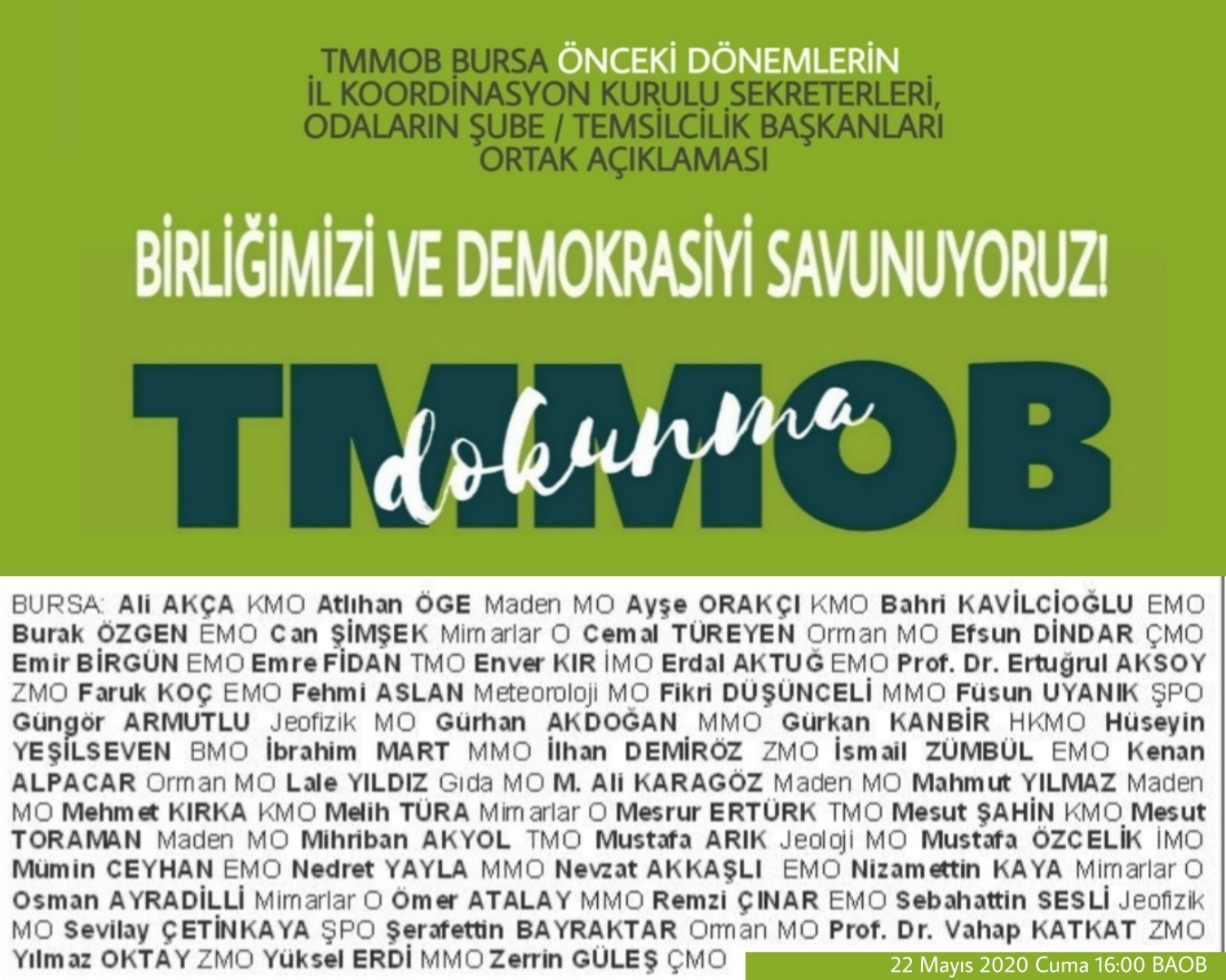 Bizler, TMMOB Bursa, Önceki Dönemlerin İl Koordinasyon Kurulu Sekreterleri ve Şube/Temsilcilik Başkanları olarak, Birliğimizin demokratik işleyişinin, kamusal gücünün, ilerici duruşunun ortadan kaldırılması yönündeki her türden girişimin karşısında olduğumuzu, örgütlerimizi siyasi iradenin güdümüne sokacak her türlü girişimi reddettiğimizi bir kez daha ifade ediyor, kamuoyu ile paylaşıyoruz.
