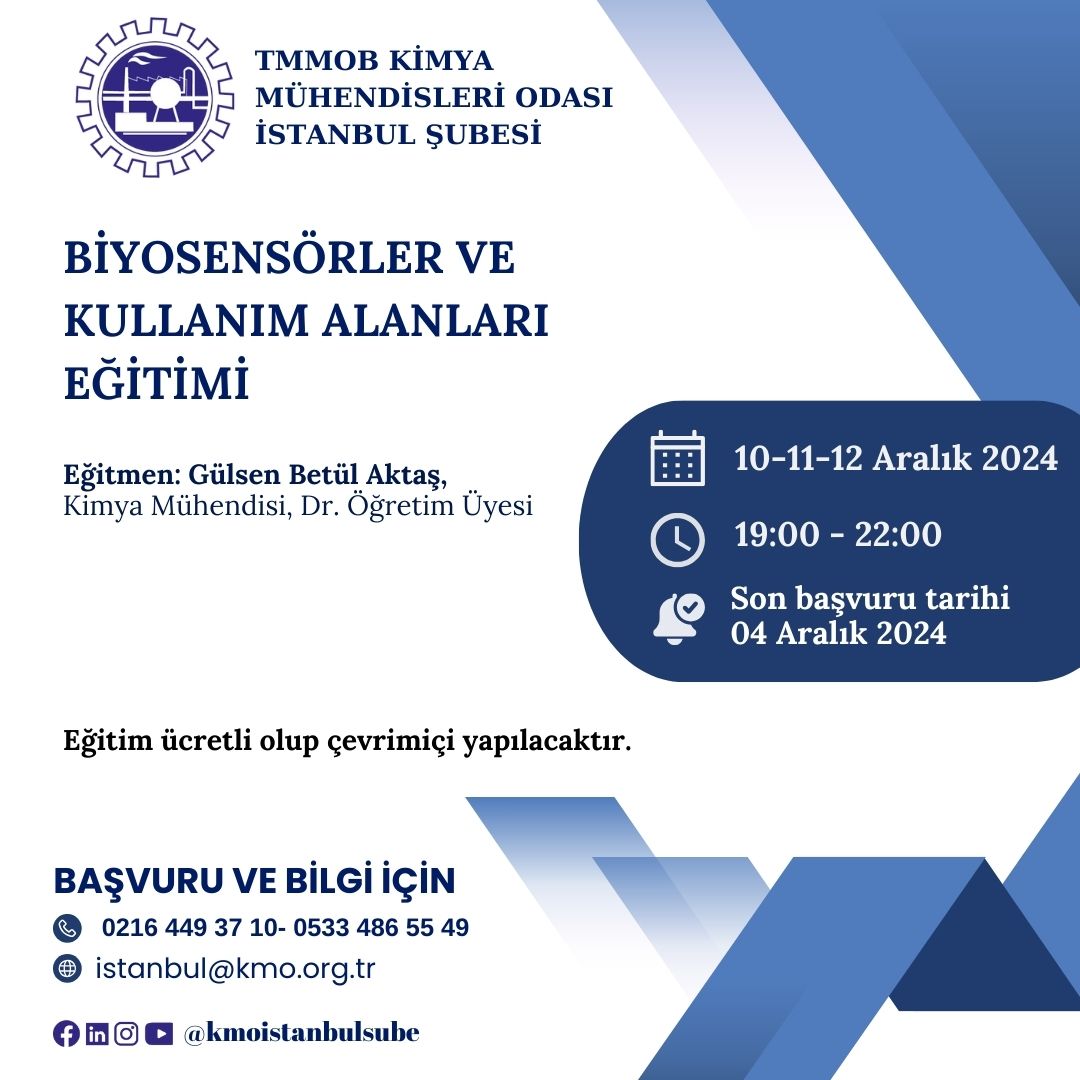 TMMOB Kimya Mühendisleri Odası İstanbul Şubesi tarafından 10-11-12 Aralık 2024 tarihinde, Saat: 19:00-22:00 arasında, "Biyosensörler ve Kullanım Alanları Eğitimi" online olarak ZOOM uygulaması üzerinden düzenlenecektir. Eğitim ile ilgili detaylı bilgi aşağıda yer almakta olup eğitim başvuru formu ekte iletilmiştir. Eğitime katılmak isteyenlerin, başvuru formunu doldurarak 4 Aralık 2024 tarihine kadar istanbul@kmo.org.tr adresine göndermelerini rica ederiz.