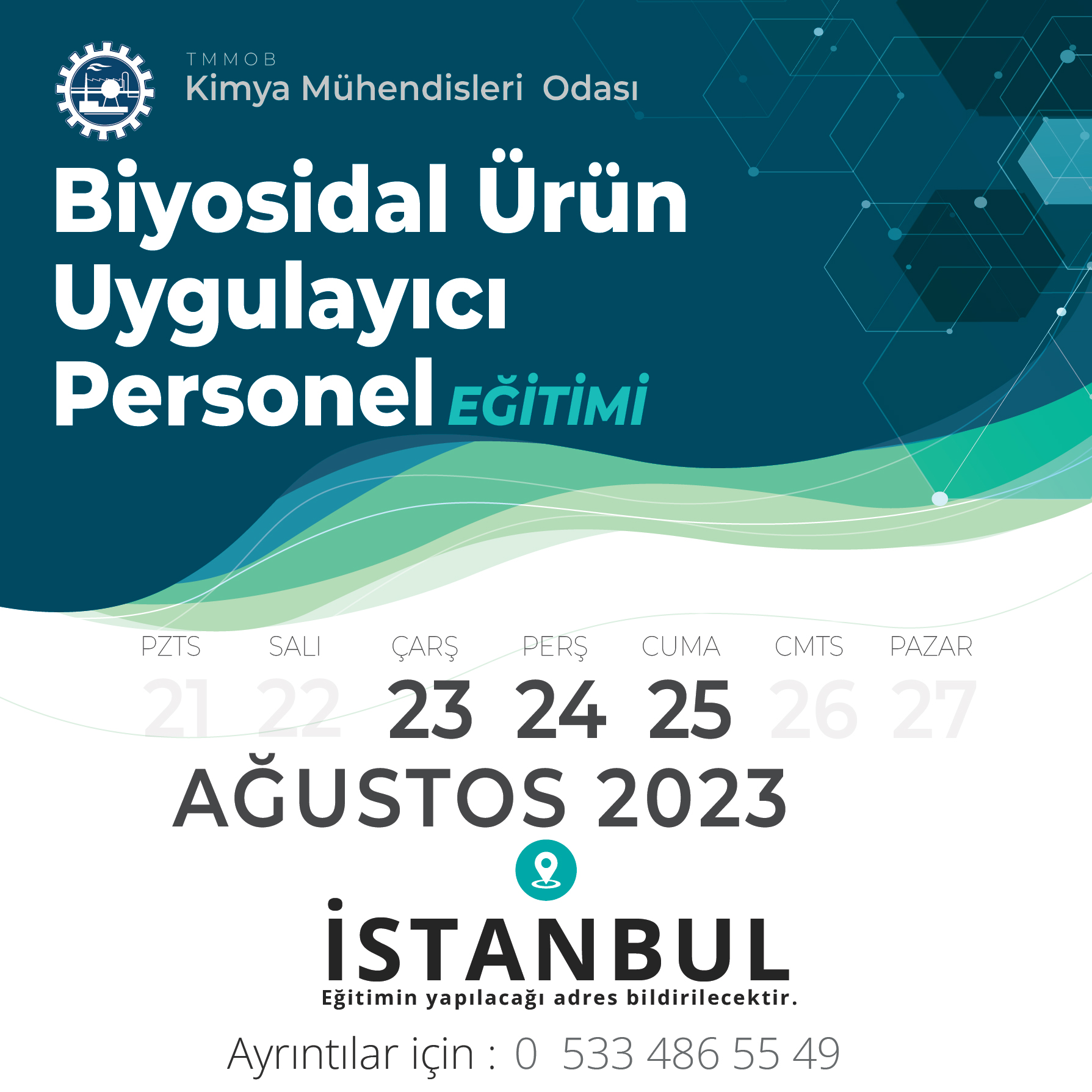 Odamız tarafından İstanbul'da 23-24-25 Ağustos 2023 tarihlerinde BİYOSİDAL ÜRÜN UYGULAYICI PERSONEL EĞİTİMİ düzenlenecektir. Eğitimle ilgili bilgiler aşağıda yer almakta olup katılım koşullarını sağlayan ve eğitime katılmak isteyen kişilerin ekte/dosyalar kısmında yer alan başvuru formunu doldurarak istanbul@kmo.org.tr e-mail adresine göndermelerini rica ederiz.