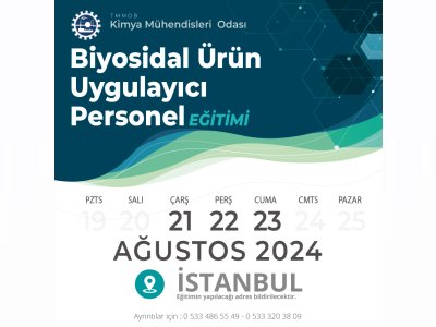 21-22-23 Ağustos 2024 tarihlerinde İstanbul`da yüz yüze düzenlenecek `BİYOSİDAL ÜRÜN UYGULAYICI PERSONEL EĞİTİMİ`ne kayıt için gerekli evraklarla istanbul@kmo.org.tr adresine e-posta atmanız veya şubemize uğramanız gerekmektedir.