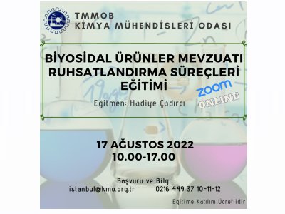 17 Ağustos 2022 tarihinde 10.00-17.00 saatleri arasında düzenleyeceğimiz `Biyosidal Ürünler Mevzuatı, Ruhsatlandırma Süreçleri Eğitimi` miz Zoom programı üzerinden online olarak gerçekleşecektir.