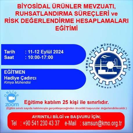 11-12 Eylül 2024 Tarihinde "Biyosidal Ürünler Mevzuatı, Ruhsatlandırma Süreçleri ve Risk Değerlendirme Hesaplamaları Eğitimi" yapılacaktır.