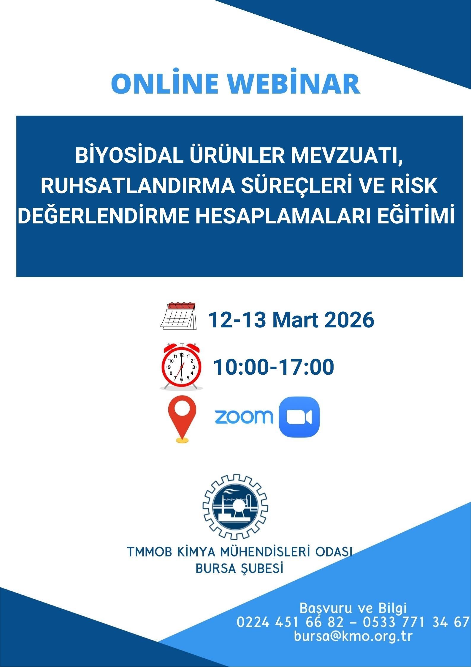 Odamız tarafından 12-13 Mart 2026 tarihlerinde 10.00-17.00 saatleri arasında "Biyosidal Ürünler Mevzuatı, Ruhsatlandırma Süreçleri ve Risk Değerlendirme Hesaplamaları Eğitimi" Zoom programı üzerinden online olarak düzenlenecektir. Eğitim ile ilgili detaylı bilgi aşağıda yer almakta olup eğitime katılmak isteyenlerin, başvuru formunu https://kmobis.kmo.org.tr/uploads/editor/2026-02-23-12-35-24-473343.doc doldurup istenen belgeler ile birlikte 10 Mart 2026 tarihine kadar bursa@kmo.org.tr adresine göndermelerini rica ederiz.