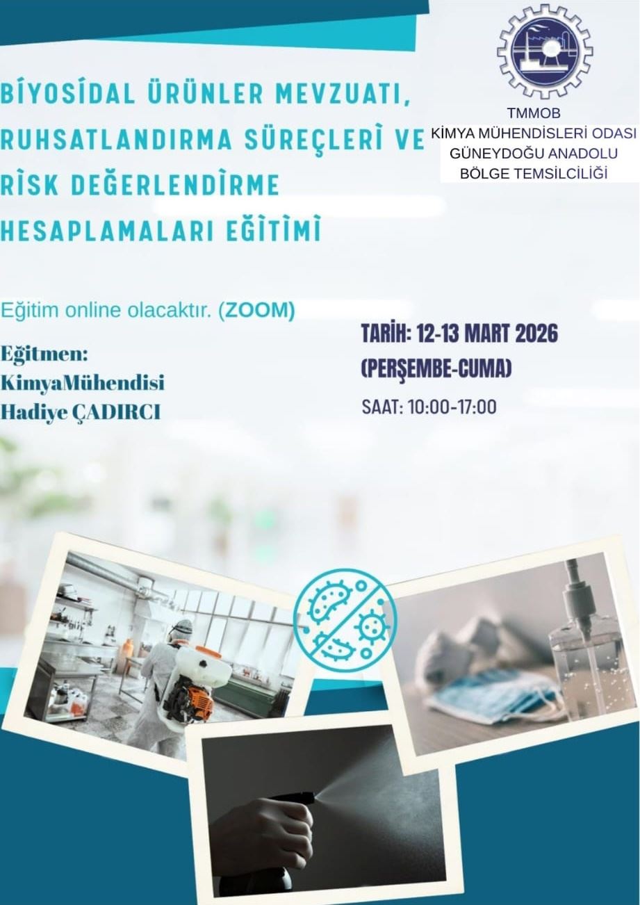 BİYOSİDAL ÜRÜNLER MEVZUATI, RUHSATLANDIRMA SÜREÇLERİ VE RİSK DEĞERLENDİRME HESAPLAMALARI EĞİTİMİ Şubemiz tarafından 12-13 Mart 2026 tarihlerinde 10.00-17.00 saatleri arasında "Biyosidal Ürünler Mevzuatı, Ruhsatlandırma Süreçleri ve Risk Değerlendirme Hesaplamaları Eğitimi" zoom programı üzerinden online olarak düzenlenecektir. Eğitim ile ilgili detaylı bilgi aşağıda yer almakta olup eğitime katılmak isteyenlerin, ekte gönderilen başvuru formunu doldurup istenen belgeler ile birlikte 10 Mart 2026 tarihine kadar gabtm@kmo.org.tr adresine göndermelerini rica ederiz.