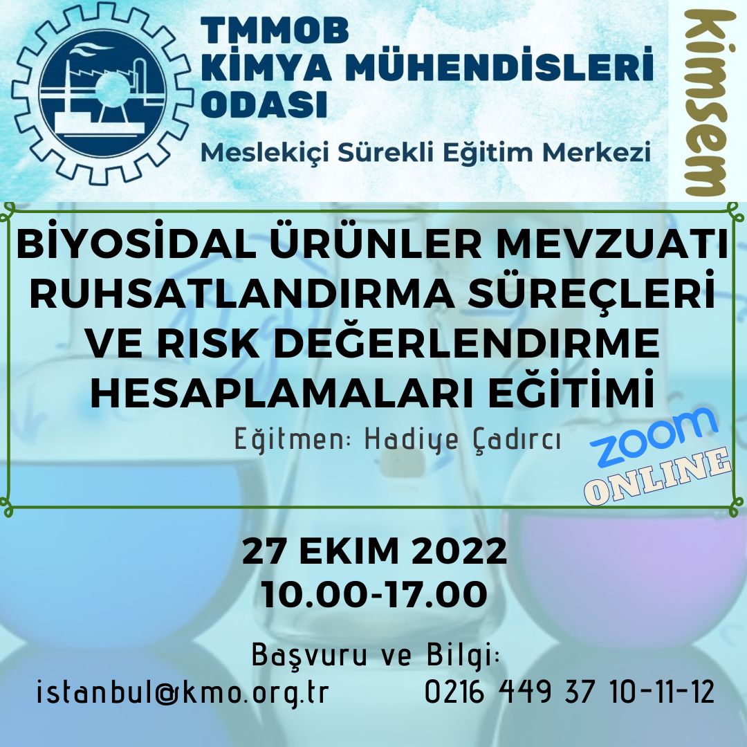 Kimya Mühendisleri Odası olarak 27 Ekim 2022 tarihinde 10.00-17.00 saatleri arasında düzenleyeceğimiz "Biyosidal Ürünler Mevzuatı, Ruhsatlandırma Süreçleri ve Risk Değerlendirme Hesaplamaları Eğitimi" Zoom programı üzerinden online olarak gerçekleşecektir. Eğitim ile ilgili detaylı bilgi aşağıda olup eğitime katılmak isteyenlerin, ekte gönderilen başvuru formunu doldurup istenen belgeler ile birlikte istanbul@kmo.org.tr adresine göndermelerini rica ederiz.