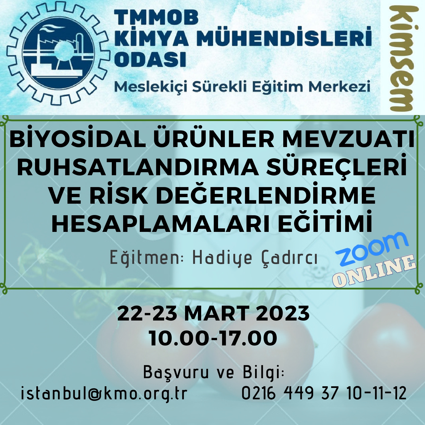 Şubemiz tarafından 22-23 Mart 2023 tarihlerinde 10.00-17.00 saatleri arasında `Biyosidal Ürünler Mevzuatı, Ruhsatlandırma Süreçleri ve Risk Değerlendirme Hesaplamaları Eğitimi` Zoom programı üzerinden online olarak düzenlenecektir.