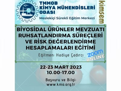 Odamız tarafından 22-23 Mart 2023 tarihlerinde 10.00-17.00 saatleri arasında "Biyosidal Ürünler Mevzuatı, Ruhsatlandırma Süreçleri ve Risk Değerlendirme Hesaplamaları Eğitimi" Zoom programı üzerinden online olarak düzenlenecektir. Eğitim ile ilgili detaylı bilgi aşağıda yer almakta olup eğitime katılmak isteyenlerin, ekte gönderilen başvuru formunu doldurup istenen belgeler ile birlikte bursa@kmo.org.tr adresine göndermelerini rica ederiz.