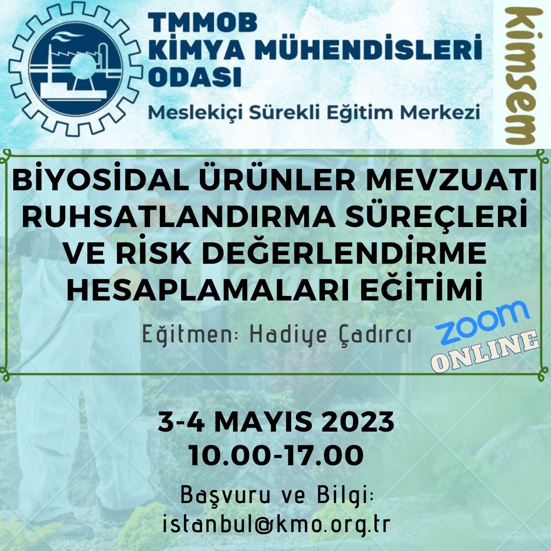 Şubemiz tarafından 3-4 Mayıs 2023 tarihlerinde 10.00-17.00 saatleri arasında `Biyosidal Ürünler Mevzuatı, Ruhsatlandırma Süreçleri ve Risk Değerlendirme Hesaplamaları Eğitimi` zoom programı üzerinden online olarak düzenlenecektir.