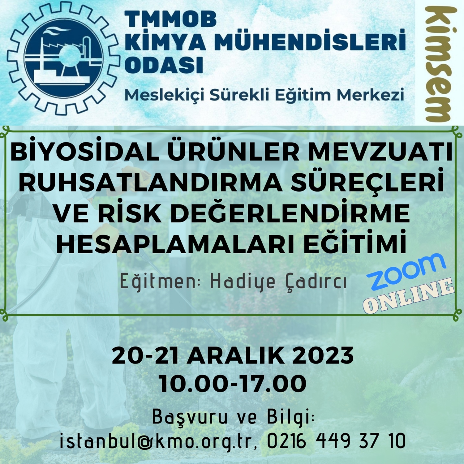 Şubemiz tarafından 20-21 Aralık 2023 tarihlerinde 10.00-17.00 saatleri arasında "Biyosidal Ürünler Mevzuatı, Ruhsatlandırma Süreçleri ve Risk Değerlendirme Hesaplamaları Eğitimi" zoom programı üzerinden online olarak düzenlenecektir. Eğitim ile ilgili detaylı bilgi aşağıda yer almakta olup eğitime katılmak isteyenlerin, ekte gönderilen başvuru formunu doldurup istenen belgeler ile birlikte 16 Aralık 2023 tarihine kadar istanbul@kmo.org.tr adresine göndermelerini rica ederiz.