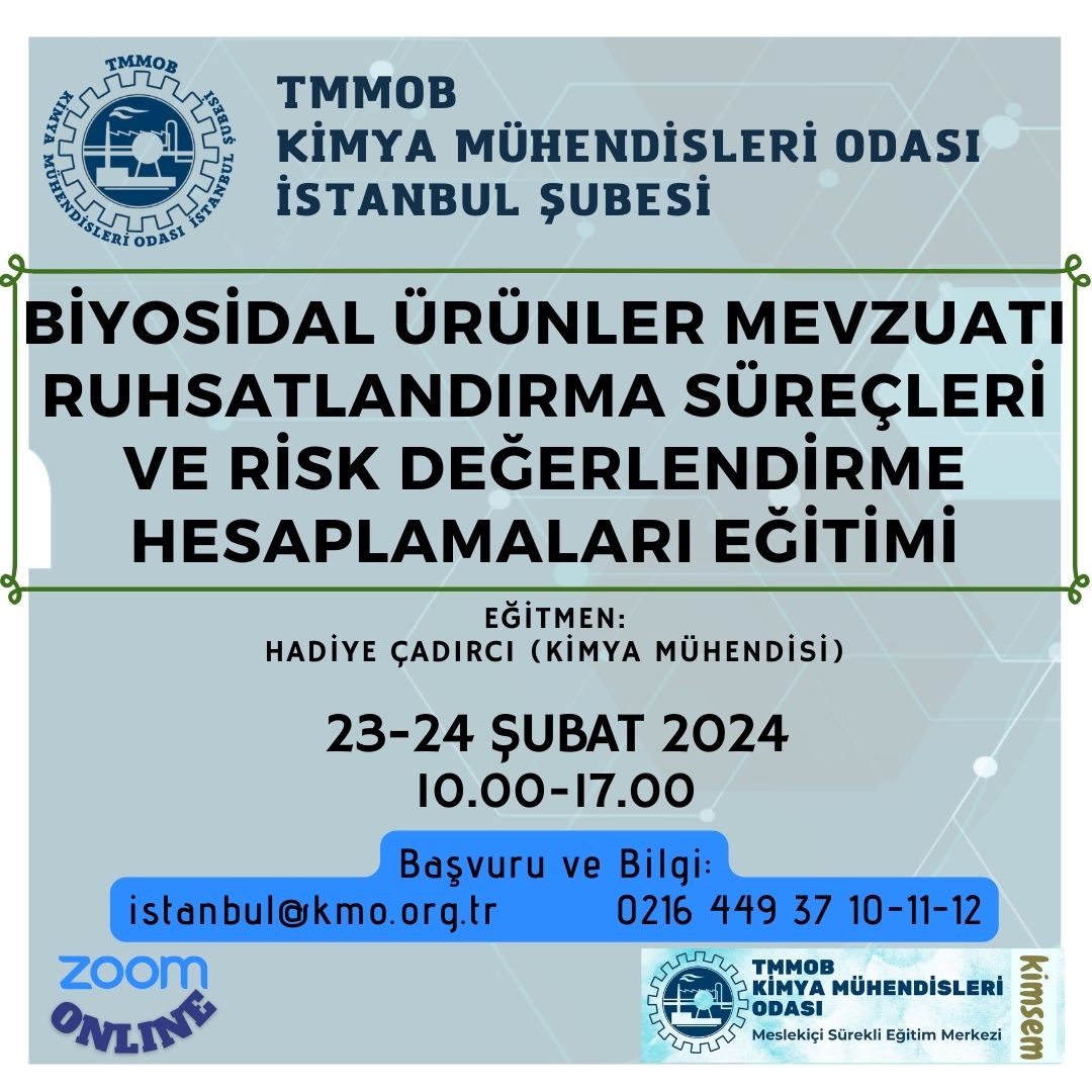 Şubemiz tarafından 23-24 Şubat 2024 tarihlerinde 10.00-17.00 saatleri arasında `Biyosidal Ürünler Mevzuatı, Ruhsatlandırma Süreçleri ve Risk Değerlendirme Hesaplamaları Eğitimi` zoom programı üzerinden online olarak düzenlenecektir.