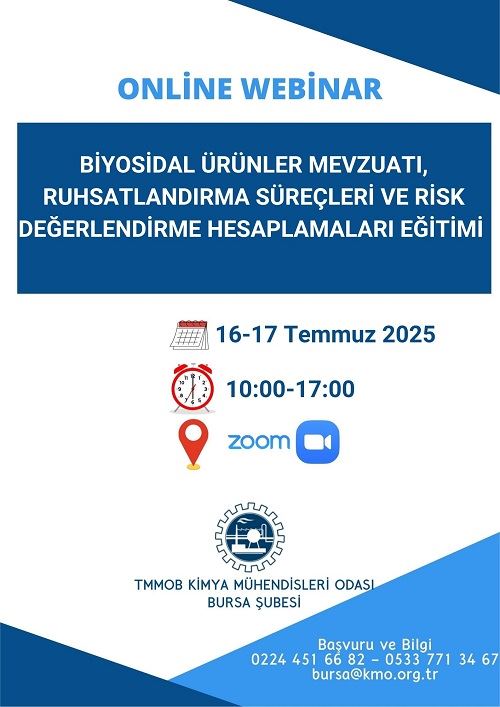 TMMOB Kimya Mühendisleri Odası tarafından 16-17 Temmuz 2025 tarihlerinde 10.00-17.00 saatleri arasında "Biyosidal Ürünler Mevzuatı, Ruhsatlandırma Süreçleri ve Risk Değerlendirme Hesaplamaları Eğitimi" zoom programı üzerinden online olarak düzenlenecektir. Eğitim ile ilgili detaylı bilgi aşağıda yer almakta olup eğitime katılmak isteyenlerin, ekte gönderilen başvuru formunu doldurup istenen belgeler ile birlikte 8 Temmuz 2025 tarihine kadar bursa@kmo.org.tr adresine göndermelerini rica ederiz.