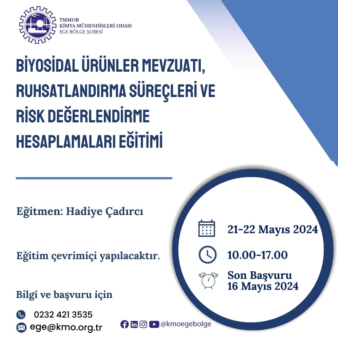 TMMOB Kimya Mühendisleri Odası tarafından 21-22 Mayıs 2024 tarihlerinde 10.00-17.00 saatleri arasında "Biyosidal Ürünler Mevzuatı, Ruhsatlandırma Süreçleri ve Risk Değerlendirme Hesaplamaları Eğitimi" zoom programı üzerinden online olarak düzenlenecektir. Eğitim ile ilgili detaylı bilgi aşağıda yer almakta olup eğitime katılmak isteyenlerin, ekte gönderilen başvuru formunu doldurup istenen belgeler ile birlikte 16 Mayıs 2024 tarihine kadar ege@kmo.org.tr adresine göndermelerini rica ederiz.