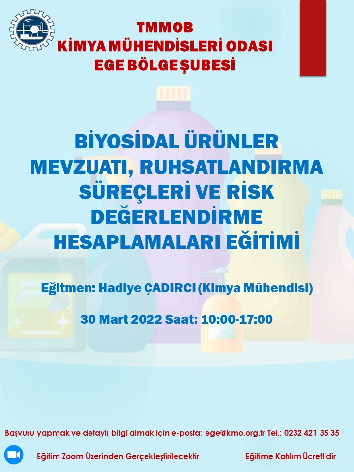 30 Mart 2022 tarihinde 10.00-17.00 saatleri arasında düzenleyeceğimiz "Biyosidal Ürünler Mevzuatı, Ruhsatlandırma Süreçleri ve Risk Değerlendirme Hesaplamaları Eğitimi" miz Zoom programı üzerinden online olarak gerçekleşecektir. Eğitim ile ilgili detayı ve başvuru formunu ekte bulabilirsiniz. Eğitime katılmak isteyenlerin, başvuru formunu doldurarak guney@kmo.org.tr e-mail adresine göndermelerini rica ederiz.