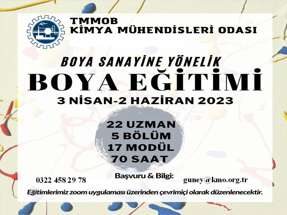 Kimya Mühendisleri Odası olarak boya sektöründe çalışan meslektaşlarımız (Kimya Mühendisleri) başta olmak üzere Kimyager, uzman ve yöneticilerin ihtiyaç duyabilecekleri bilgileri içermek üzere tasarlanan genel boya eğitimlerini sektörden gelen talep üzerine tekrar düzenlemekteyiz.
