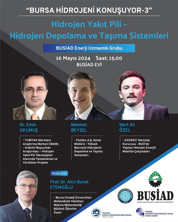 16 Mayıs 2024 tarihinde, Bursa Sanayicileri ve İş insanları Derneği (BUSİAD) Enerji Uzmanlık Grubu tarafından düzenlenen Bursa Hidrojeni Konuşuyor etkinliklerinin üçüncüsü, "Hidrojen Yakıt Pili-Hidrojen Depolama ve Taşıma Sistemleri" başlığıyla BUSİAD Evi`nde düzenlenen etkinliğe katılım sağladık.