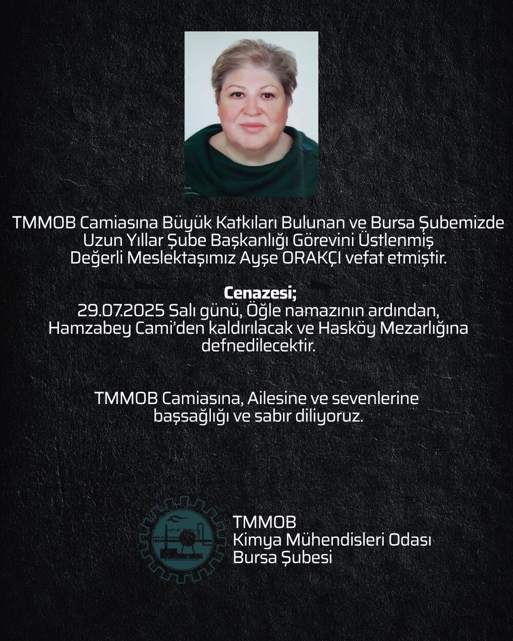 TMMOB Camiasına Büyük Katkıları Bulunan ve Bursa Şubemizde Uzun Yıllar Şube Başkanlığı Görevini Üstlenmiş Değerli Meslektaşımız Ayşe ORAKÇI vefat etmiştir.