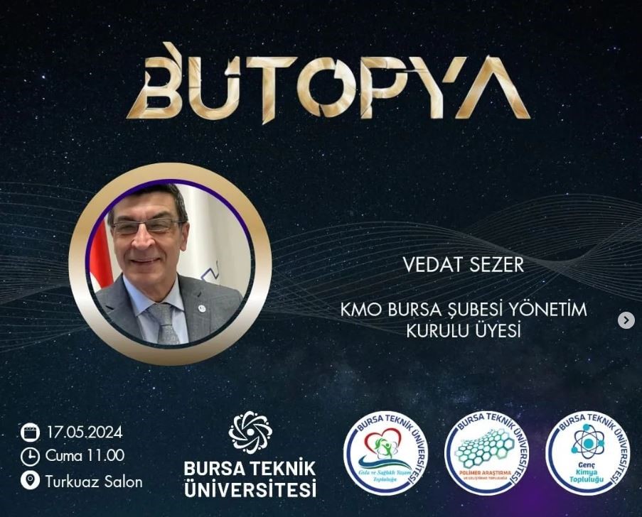 Bursa Teknik Üniversitesi Polimer Araştırma ve Geliştirme Topluluğu, Gıda ve Sağlıklı Yaşam Topluluğu ve Genç Kimya Topluluğunun işbirliği ile 16-17 Mayıs 2024 tarihlerinde düzenlenen "BÜTOPYA`24 Bilim, Teknoloji ve İnovasyon Şenliği" etkinliğine şubemiz adına yön. kur. sekreter üyesi Vedat SEZER katılmış ve öğrencilerimize Savunma Sanayii hakkında sunum ve bilgilendirme yapmıştır.
