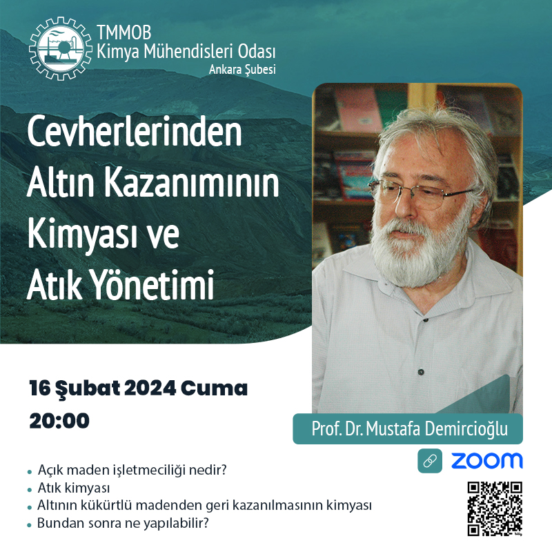 13 Şubat 2024 tarihinde Erzicanda yaşanan maden faciası sürecini daha iyi anlamak ve bundan sonra yapılması gerekenler konusunda bilgi sahibi olmak için Prof. Dr. Mustafa DEMİRCİOĞLU, "Cevherlerinden Altın Kazanımının Kimyası ve Atık Yönetimi" başlıklı webinarda bizleri aydınlatacaktır. Etkinlik 16 Şubat 2024 Cuma günü saat 20:00da başlayacaktır.