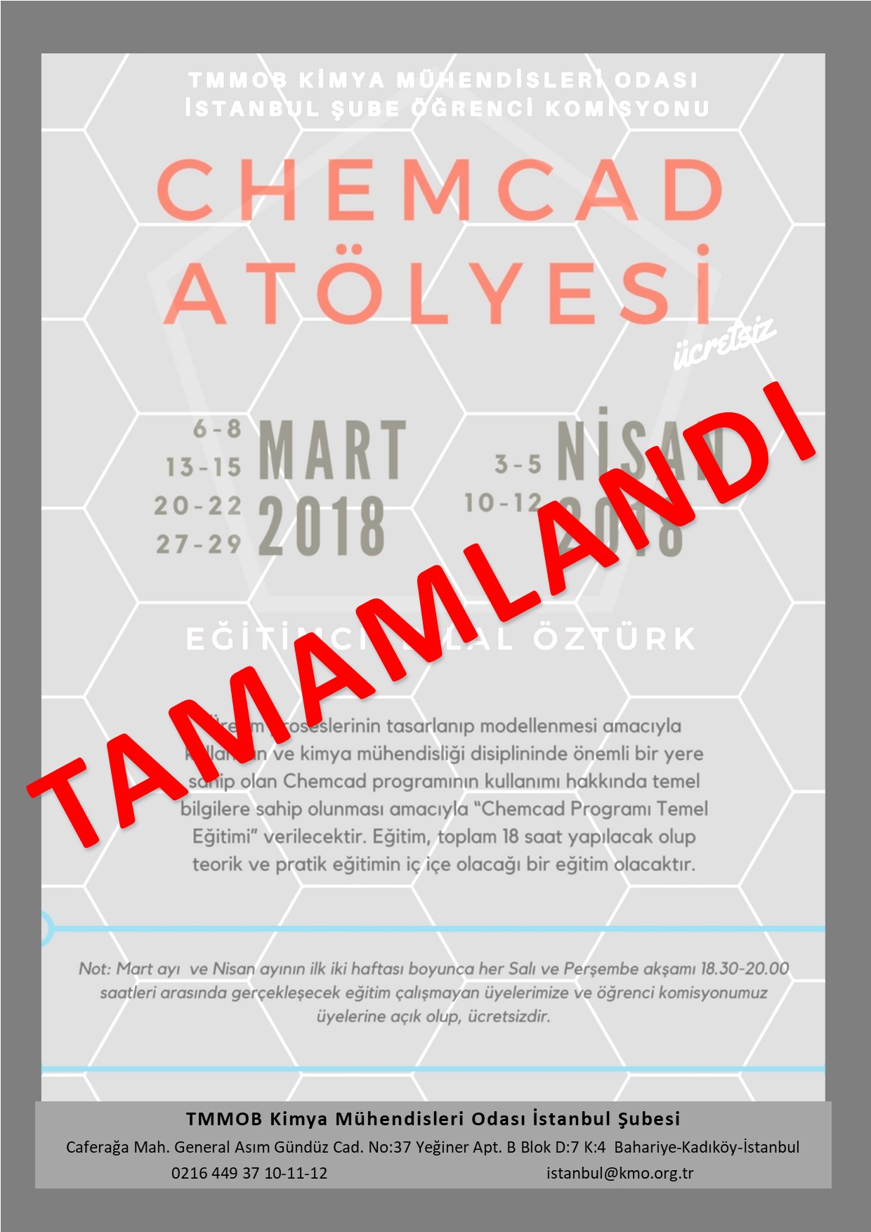 İstanbul'da değişik üniversitelerde okumakta olan Kimya Mühendisliği ve Biyomühendislik öğrencilerine ve çalışmayan üyelerimize yönelik açtığımız CHEMCAD Eğitimi ve Atölyesi tamamlandı.