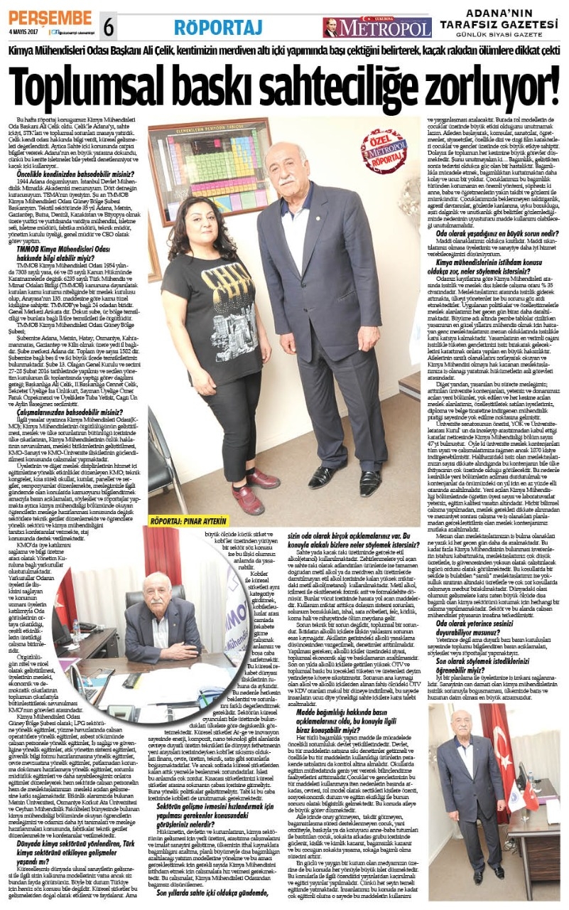 Çukurova Metropol Gazetesi Haber Müdürü Pınar Sagay Aytekin, Şube Başkanımız Ali Çelik ile odamız, şubemiz, kimya sektörü, kaçak içki ve madde bağımlılığı konularında röportaj yaptı.