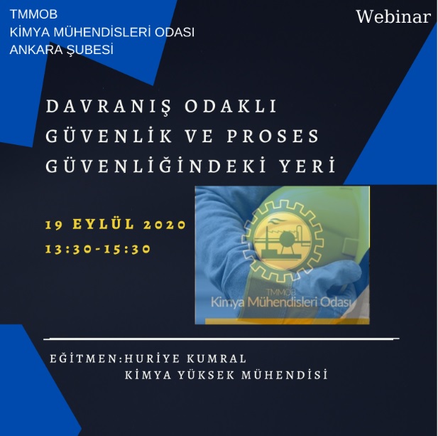 19 Eylül 2020 tarihinde 13:30 - 15:30 saatleri arasında Kimya Yüksek Mühendisi Huriye KUMRAL`ın sunumuyla Zoom üzerinden DAVRANIŞ ODAKLI GÜVENLİK ve PROSES GÜVENLİĞİNDEKİ YERİ online semineri gerçekleştirilecek olup, katılım ücretsizdir. Kayıt formu için lütfen tıklayınız.