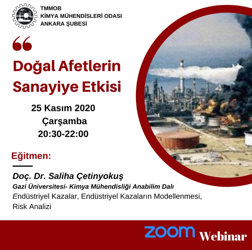 25 Kasım 2020 Çarşamba günü 20:30 - 22:00 saatleri arasında Sn. Doç. Dr. Saliha ÇETİNYOKUŞ`un sunumuyla "Doğal Afetlerin Sanayiye Etkisi" Eğitimi gerçekleştirilecektir. Ücretsiz gerçekleştirilecek eğitime katılım formu için lütfen tıklayınız.