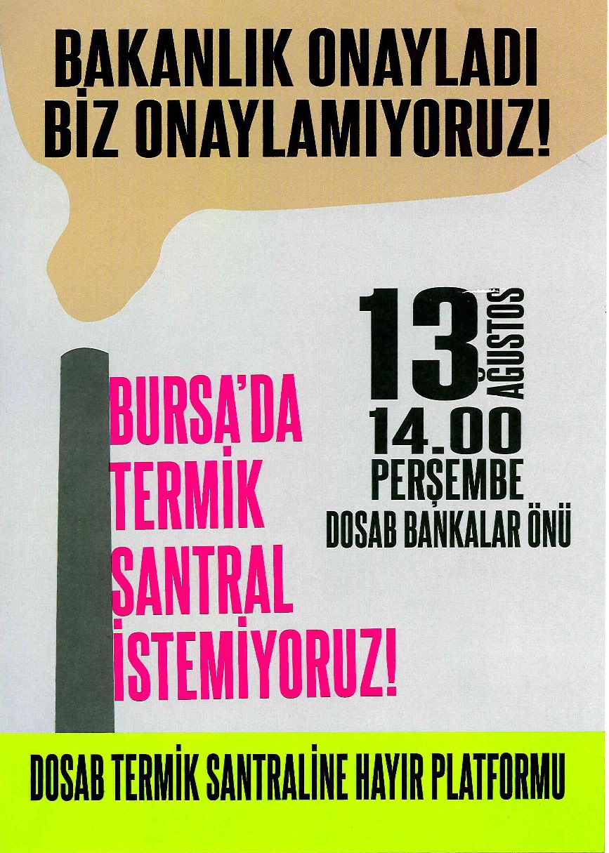 Konu ile ilgili olarak; bileşeni olduğumuz DOSAB Termik Santraline Hayır Platformu tarafından "Bakanlık Onayladı, Biz Onaylamıyoruz" demek için 13 Ağustos 2015 Perşembe günü saat 14.00da DOSAB Bankalar önünde basın açıklaması yapılacaktır.
