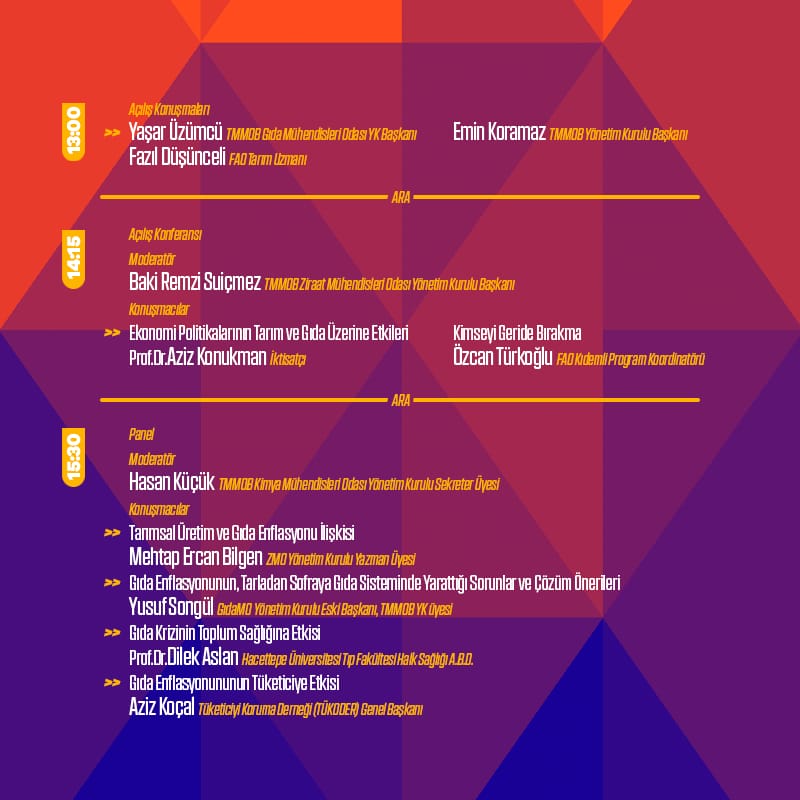 TMMOB çatısı altında bulunan Gıda, Kimya ve Ziraat Mühendisleri Odaları tarafından Dünya Gıda Günü etkinlikleri kapsamında düzenlenecek olan TMMOB Dünya Gıda Günü 2022 Sempozyumu, 15 Ekim 2022 tarihinde Ankara`da Çankaya Belediyesi Yılmaz Güney Sahnesinde, aşağıdaki programla gerçekleştirilecektir. Etkinliğimiz ücretsizdir, tüm üyelerimize ve halkımıza açıktır.