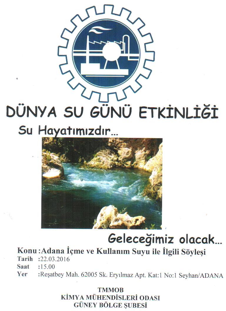 22 Mart "Dünya Su Günü" dolayısıyla şubemizde 22 Mart 2016 Salı günü saat 15.00 te suyun önemi, ilimiz içme ve kullanma su kaynakları ve su kirliliği konusunda söyleşi düzenlenecektir.