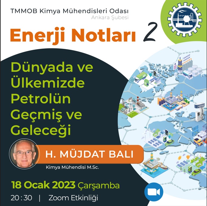 TMMOB Kimya Mühendisleri Odası Ankara Şubesi tarafından planlanan, her ay bir söyleşinin yapılacağı "Enerji Notları Söyleşileri Serisi" 18 Ocak 2023 Çarşamba günü saat:20:30da kimya mühendisi Sayın Hüsnü Müjdat BALInın "Dünyada ve Ülkemizde Petrolün Geçmiş ve Geleceği" başlıklı sunumu ile devam ediyor. Söyleşi zoom programı üzerinden uzaktan çevrimiçi düzenlenecek olup, tüm üyelerimiz davetlidir. Söyleşiye katılmak için tıklayınız.