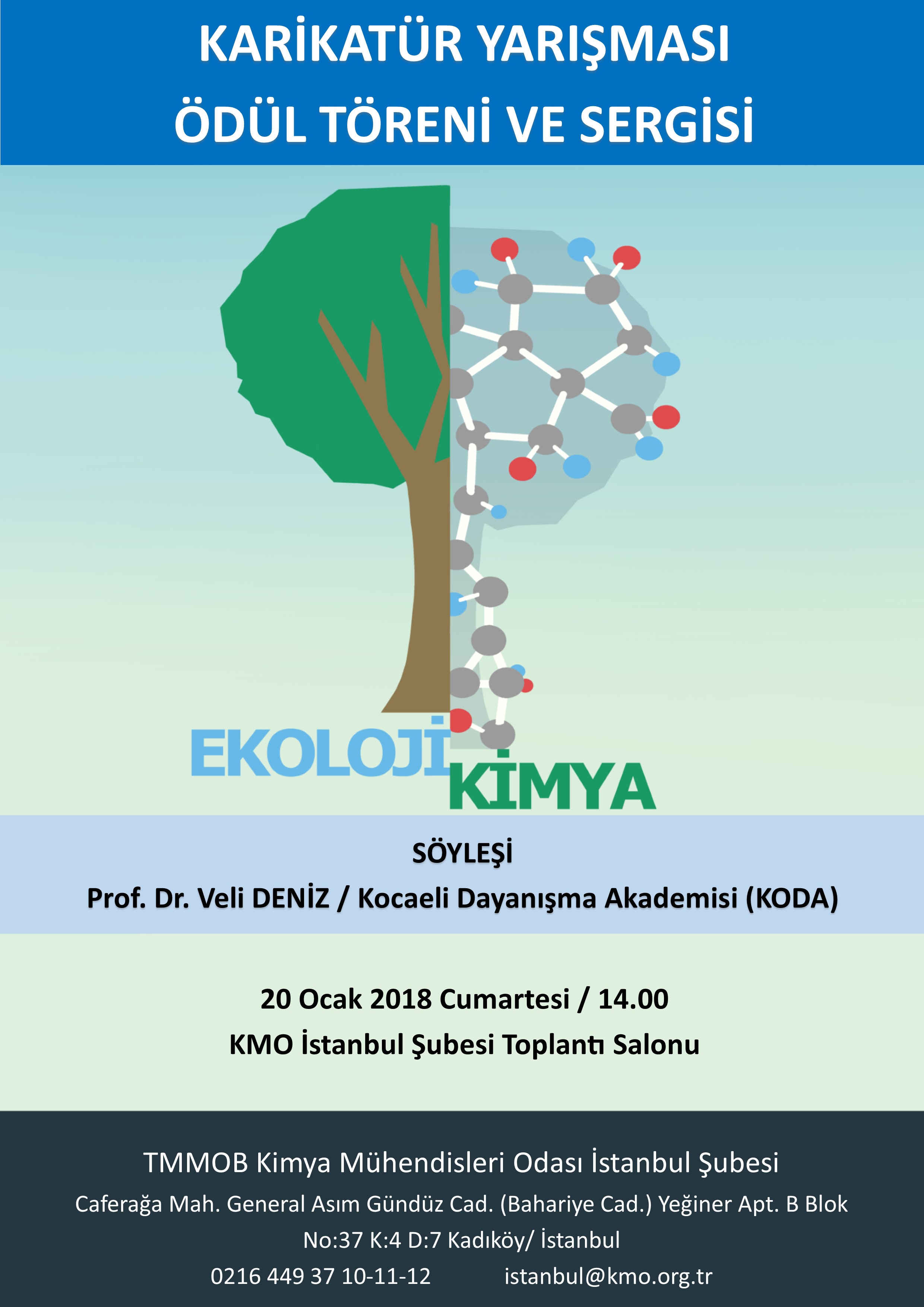 "Ekoloji ve Kimya" konulu karikatür yarışmamızın ödül töreni ve sergisi, 20 Ocak 2018 Cumartesi günü saat 14.00te Şubemizde, Kocaeli Dayanışma Akademisinden (KODA) Prof. Dr. Veli Deniz ile düzenlenecek "Ekoloji ve Kimya Söyleşisi" ile birlikte gerçekleşecektir. Etkinliğe tüm yarışmacıları, üyelerimizi ve dostlarımızı bekleriz.