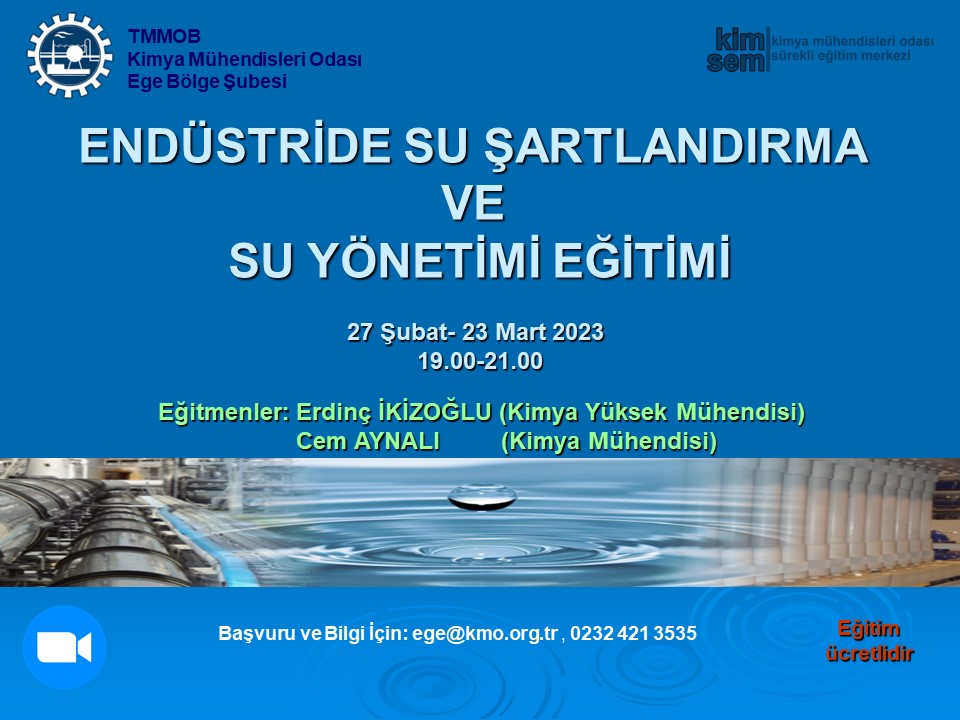 27 Şubat- 23 Mart 2023 tarihlerinde 19.00-21.00 saatleri arasında düzenleyeceğimiz `ENDÜSTRİDE SU ŞARTLANDIRMA VE SU YÖNETİMİ EĞİTİMİ` miz Zoom programı üzerinden online olarak gerçekleşecektir. Eğitim ile ilgili detaylı bilgi aşağıda olup eğitime katılmak isteyenlerin, ekte gönderilen başvuru formunu doldurup istenen belgeler ile birlikte 22 Şubat 2023 tarihine kadar, ege@kmo.org.tr adresine göndermelerini rica ederiz.