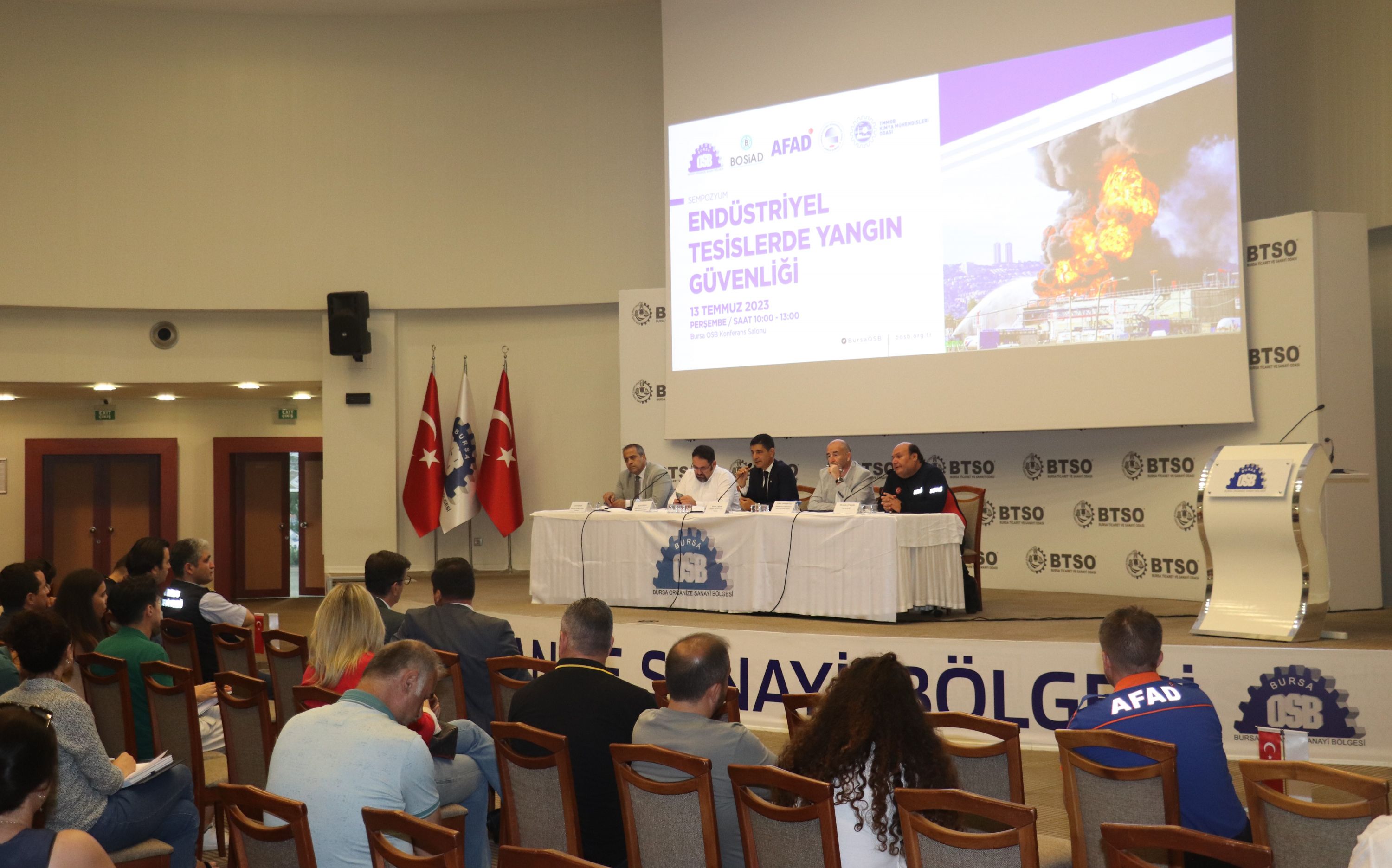 13 Temmuz 2023 tarihinde, Bursa OSB ve BOSİAD tarafından, Şubemiz ile TMMOB Elektrik Mühendisleri Odası Bursa Şubesi ve Bursa AFAD ile ortaklaşa düzenlenen "Endüstriyel Tesislerde Yangın Güvenliği" konulu sempozyum Bursa OSB Çok Amaçlı Salon`da yapıldı.