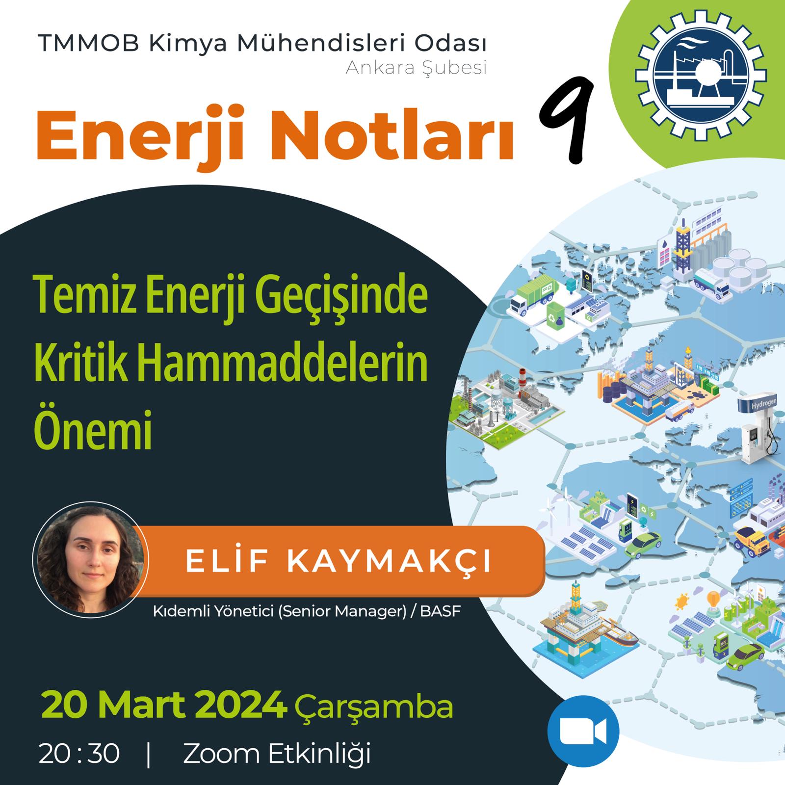 TMMOB Kimya Mühendisleri Odası Ankara Şubesi olarak başlattığımız "ENERJİ NOTLARI" online söyleşi serisi devam ediyor. Serinin 9. söyleşisinde 20 Mart 2024 Çarşamba günü saat 20:30da "Temiz Enerji Geçişinde Kritik Hammaddelerin Önemi" başlıklı sunumuyla Sayın Elif KAYMAKÇI bizlere deneyim ve birikimlerini aktaracak.