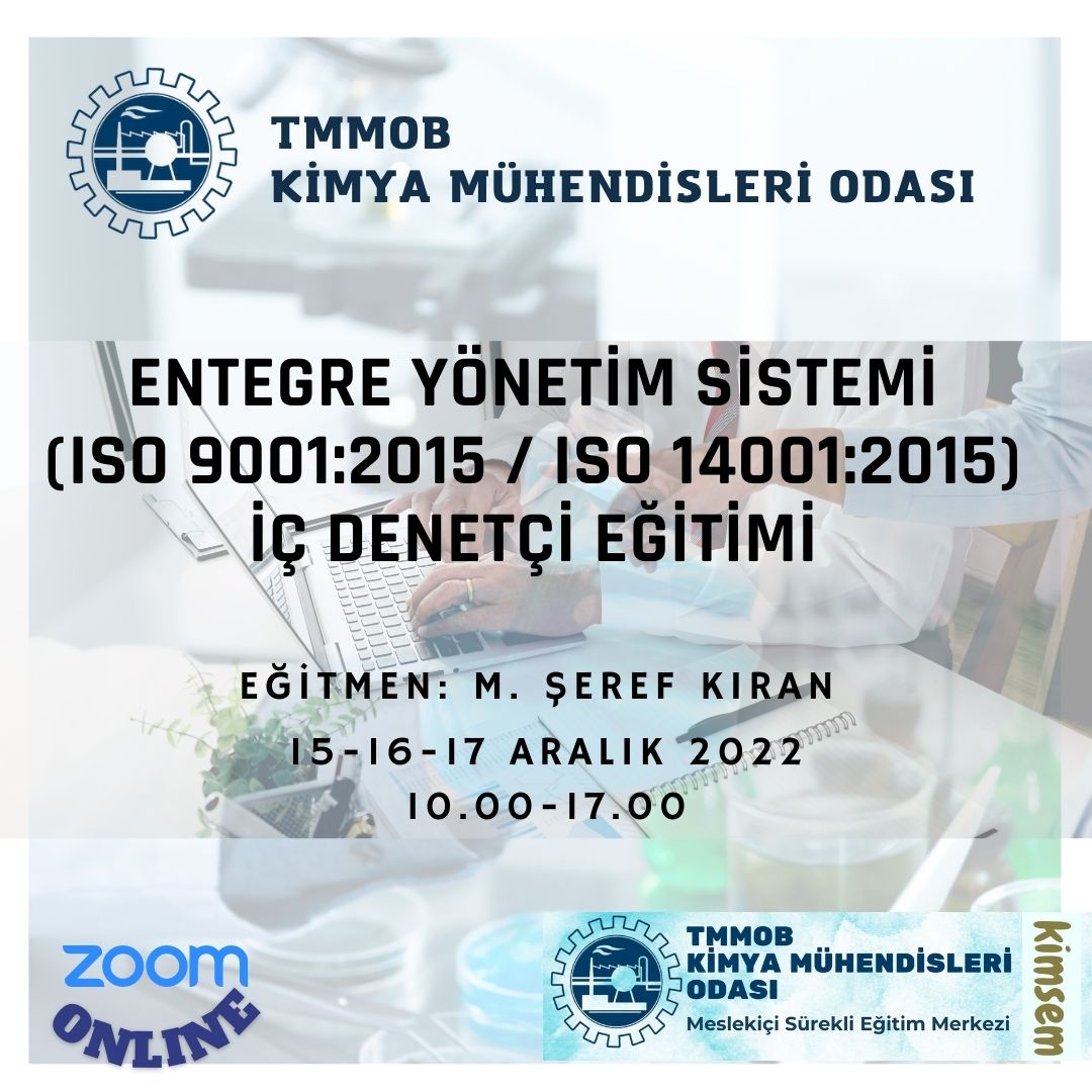 Odamız tarafından 15-16-17 Aralık 2022 tarihlerinde Entegre Yönetim Sistemi (ISO 9001:2015 / ISO 14001:2015) İç Denetçi Eğitimi zoom programı üzerinden online olarak düzenlenecektir. Eğitim ile ilgili detaylı bilgi aşağıda yer almakta olup eğitim başvuru formunu ekler/dosyalar kısmında bulabilirsiniz. Eğitime katılmak isteyen üyelerimizin eğitim katılım başvuru formunu doldurarak kocaeli@kmo.org.tr e-posta adresine göndermelerini rica ederiz.