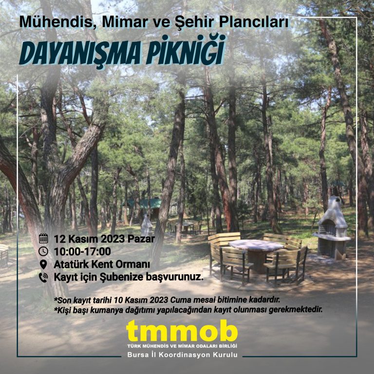 Bileşeni olduğumuz TMMOB Bursa İl Koordinasyon Kurulu olarak 12 Kasım 2023 Pazar günü 10.00 -17.00 saatleri arasında Atatürk Kent Ormanında Mühendis, Mimar ve Şehir Plancıları Dayanışma Pikniği yapılacaktır.