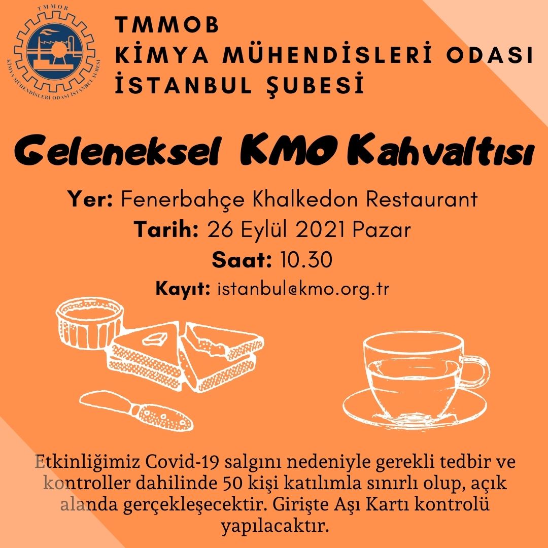 TMMOB Kimya Mühendisleri Odası İstanbul Şubesi olarak üyelerimiz arasında dayanışma ve paylaşımı artırmak amacıyla 26 Eylül 2021 Pazar günü düzenleyeceğimiz `Geleneksel KMO Kahvaltımız`da sizleri aramızda görmekten mutluluk duyarız.