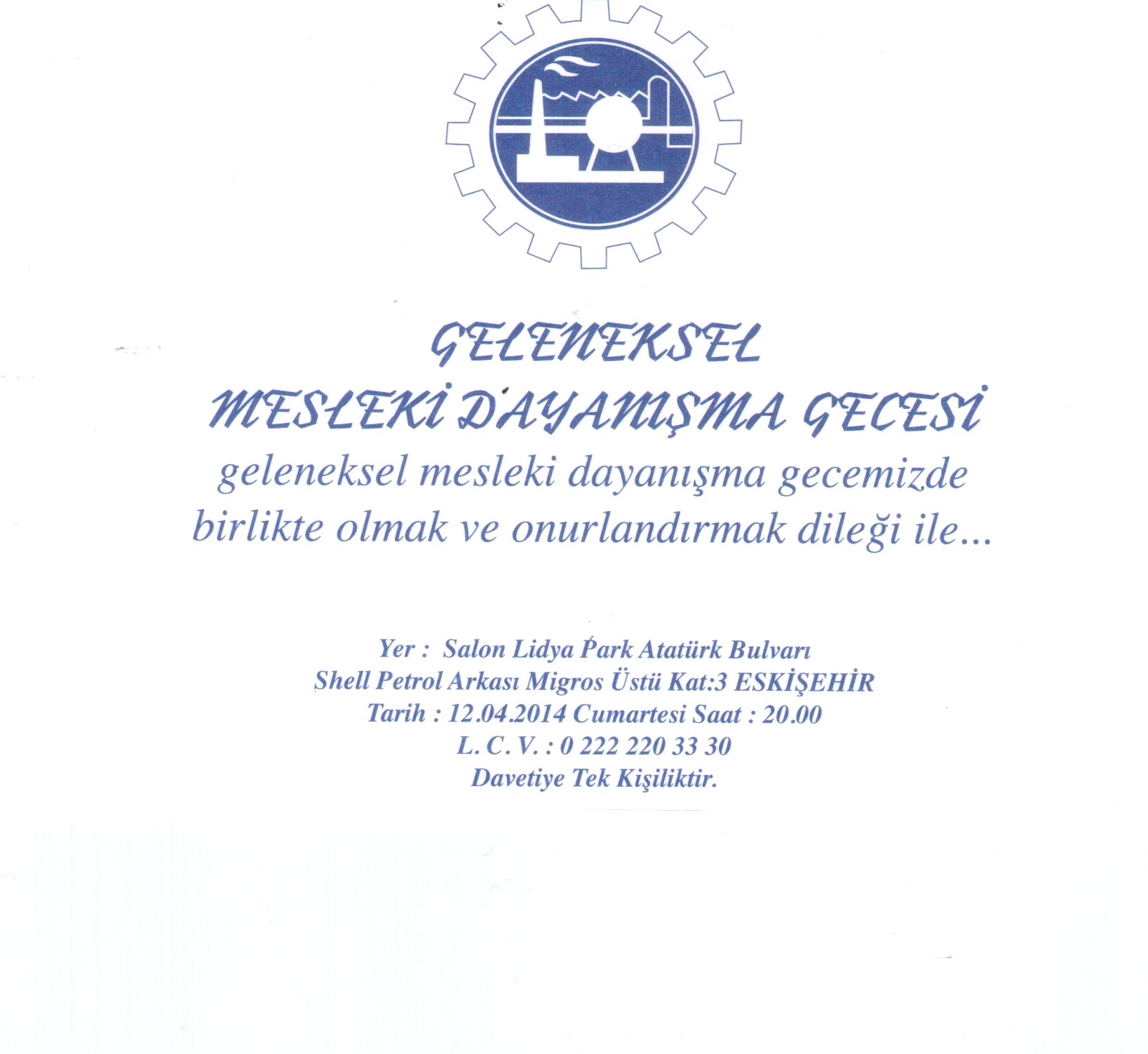 Ø Davetiyeleri ve Mesleki Dayanışma Gecemizin programı hakkında bilgiyi Bölge Temsilciliğimizden temin edilebilirsiniz.