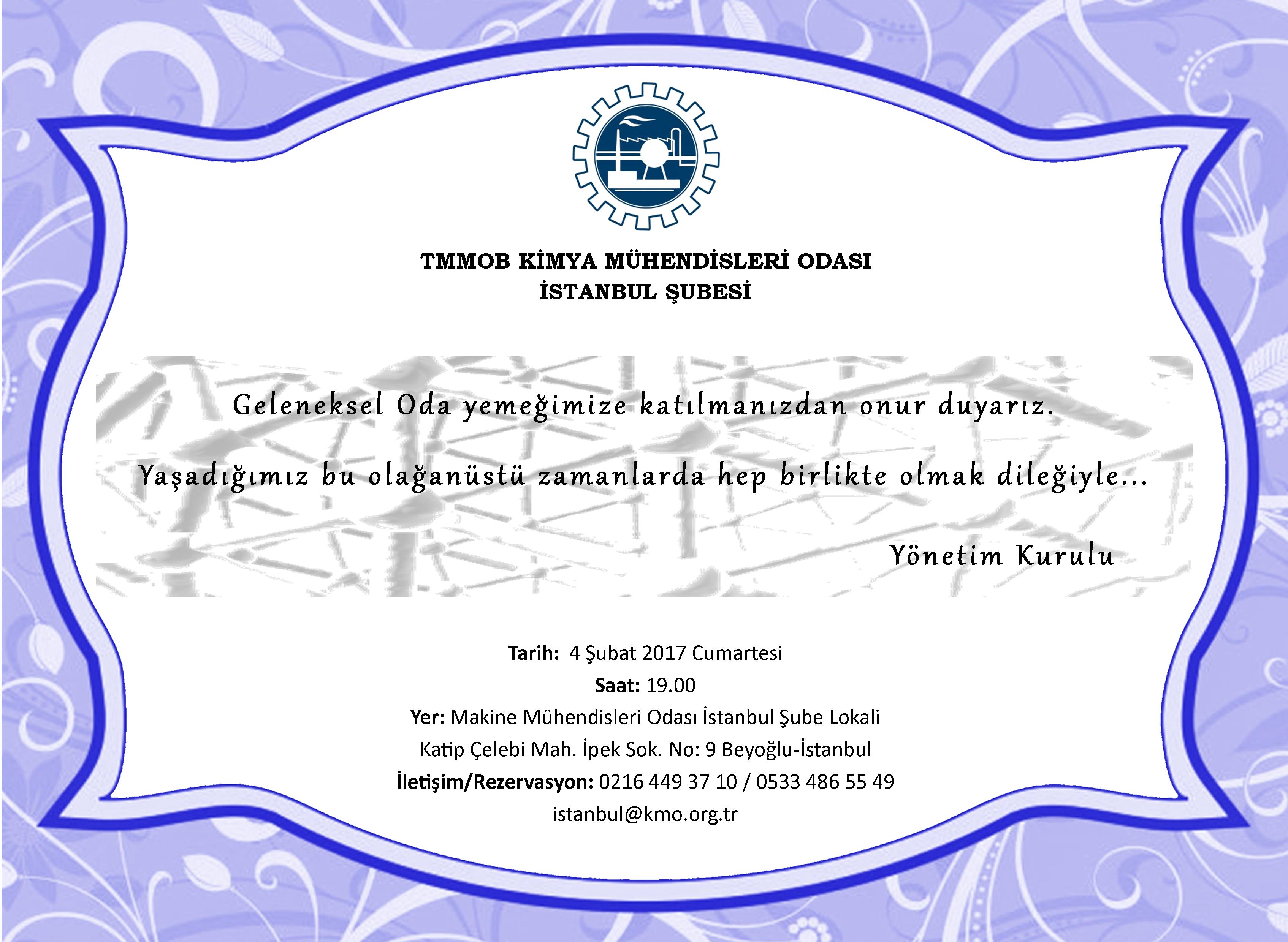 4 Şubat 2017 Cumartesi günü Geleneksel Oda Dayanışma Yemeğimize tüm üyelerimizi, dostlarımızı bekleriz.