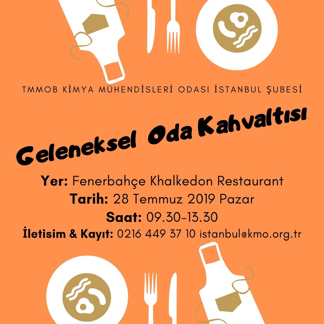 Kimya Mühendisleri Odası İstanbul Şubesi olarak üyelerimiz arasında dayanışma ve paylaşımı artırmak amacıyla 28 Temmuz 2019 Pazar günü düzenleyeceğimiz "Geleneksel Açık Büfe Oda Kahvaltımıza" sizleri aramızda görmekten mutluluk duyarız. Rezervasyon için şubemiz ile irtibata geçmenizi rica ederiz.
