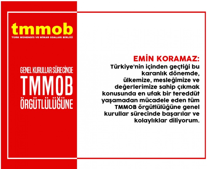 TMMOB Yönetim Kurulu Başkanı Emin Koramaz, içinde bulunduğumuz genel kurullar sürecine ilişkin 8 Ocak 2018 tarihinde tüm TMMOB örgütlülüğüne yönelik bir mesaj yayınladı.