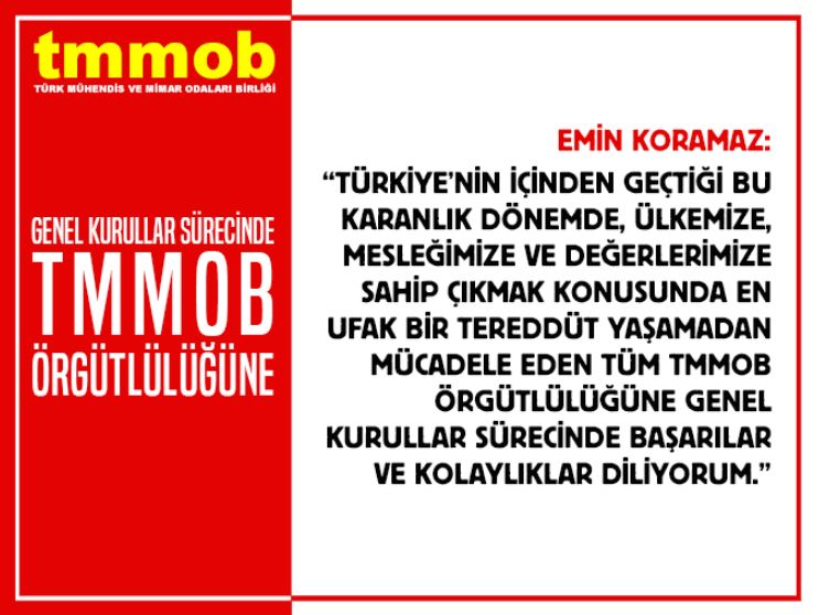 TMMOB Yönetim Kurulu Başkanı Emin Koramaz, TMMOB`ye bağlı odalara üye 600 bini aşkın mühendis, mimar ve şehir plancısının katılımcısı olduğu genel kurullar sürecine ilişkin 10 Ocak 2022 tarihinde tüm TMMOB örgütlülüğüne bir mesaj yayınladı.